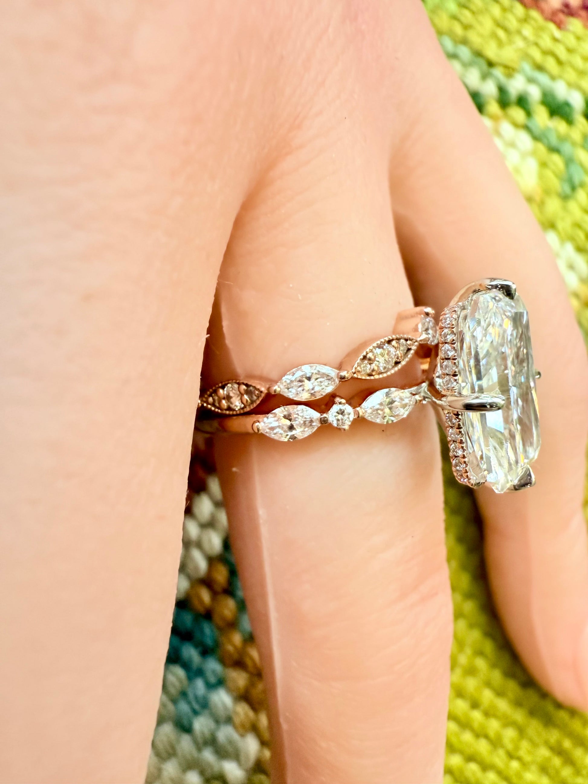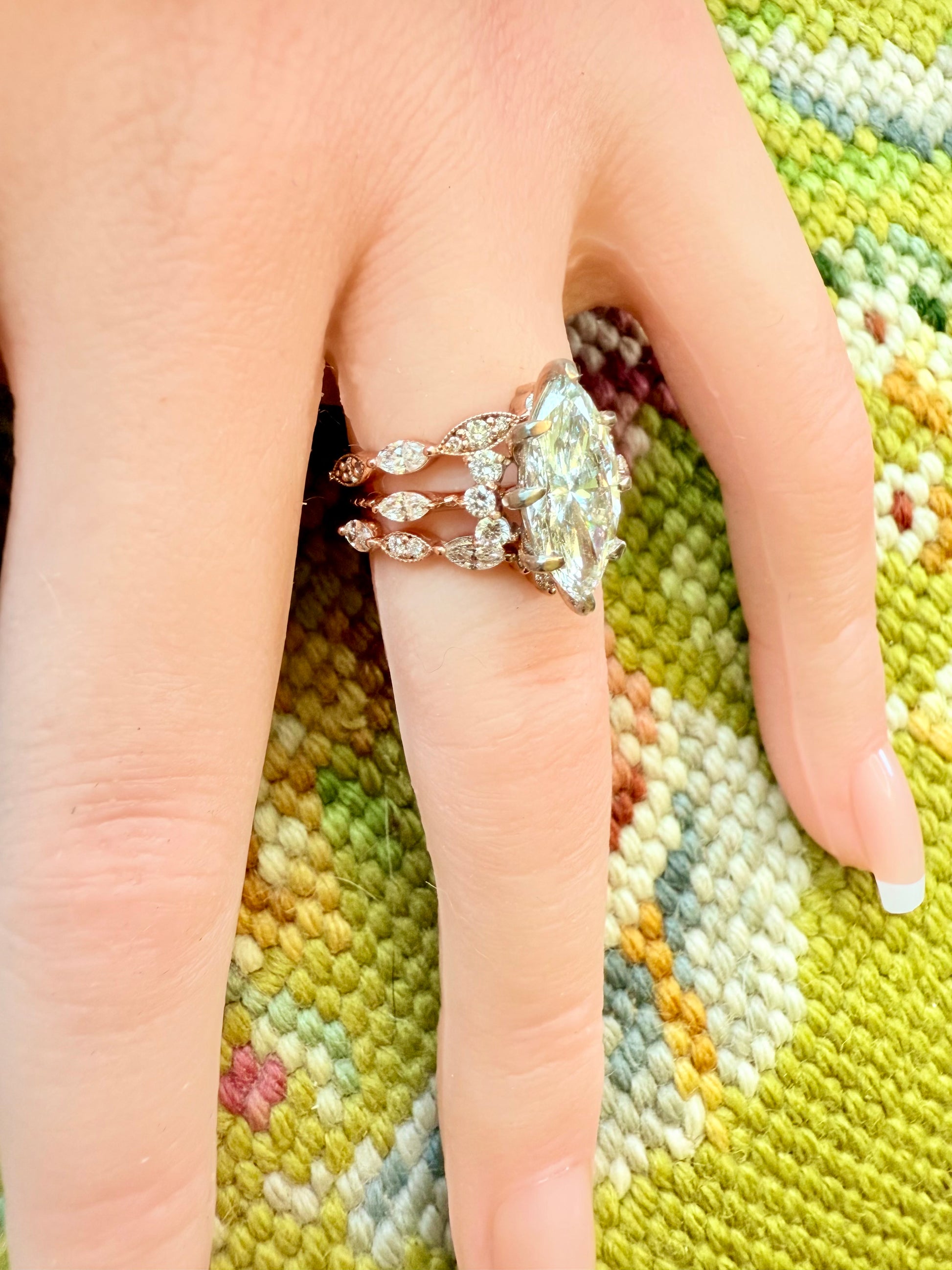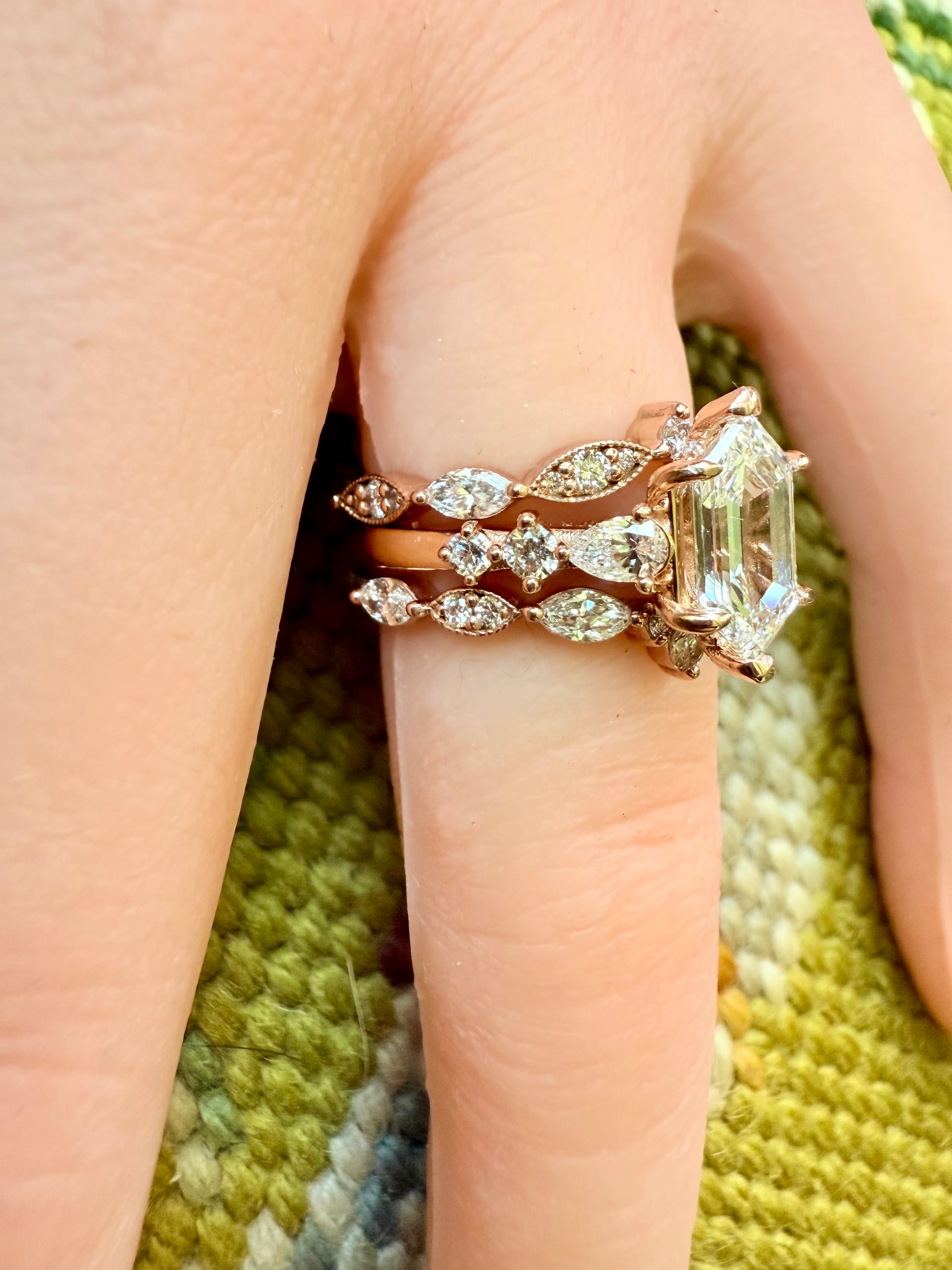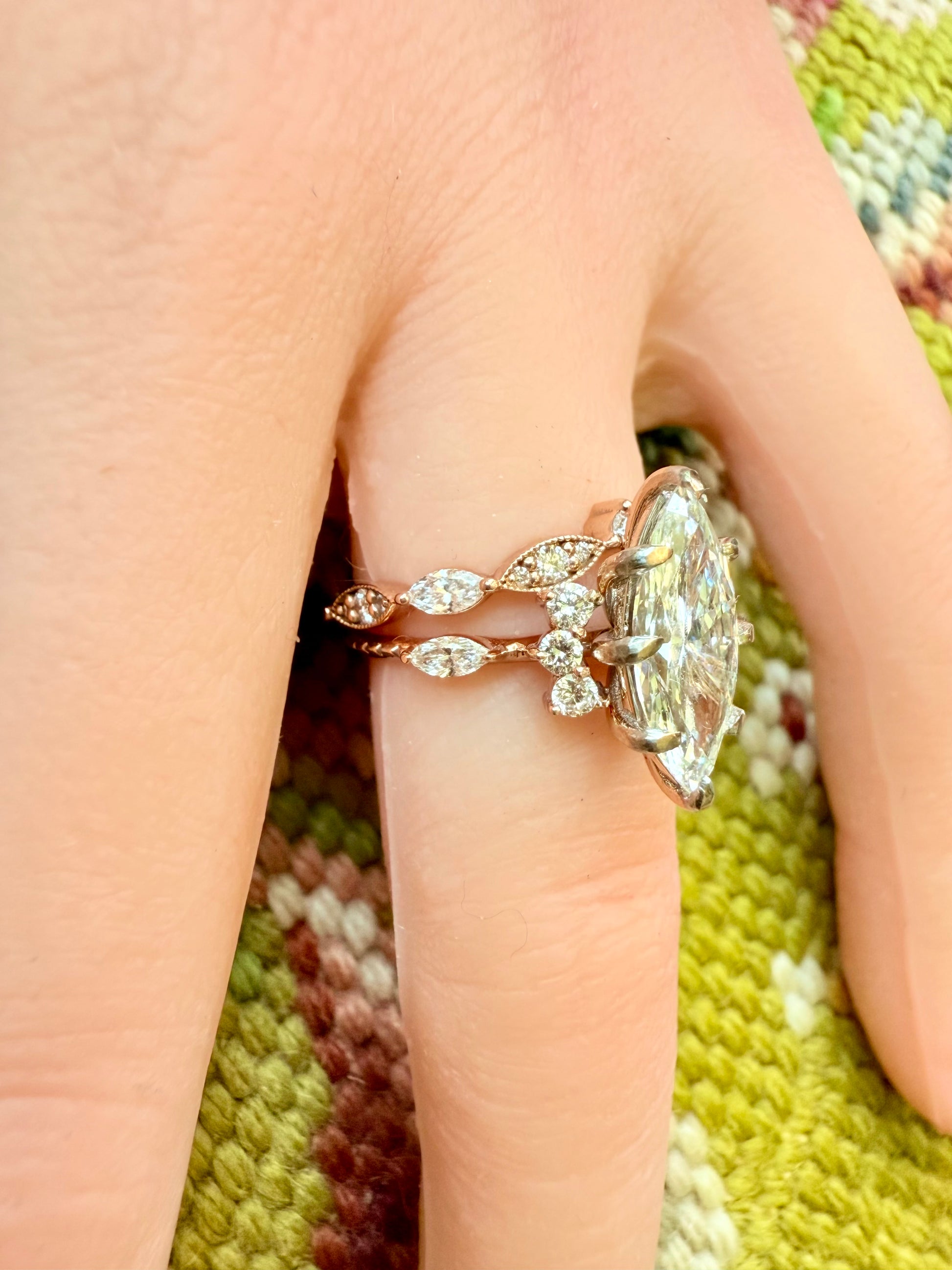 This exquisite, curved wedding band perfectly complements the Elizabeth and Vintage Marquise engagement rings, symbolizing a love that transcends infinitely with its elegantly perpetual design.