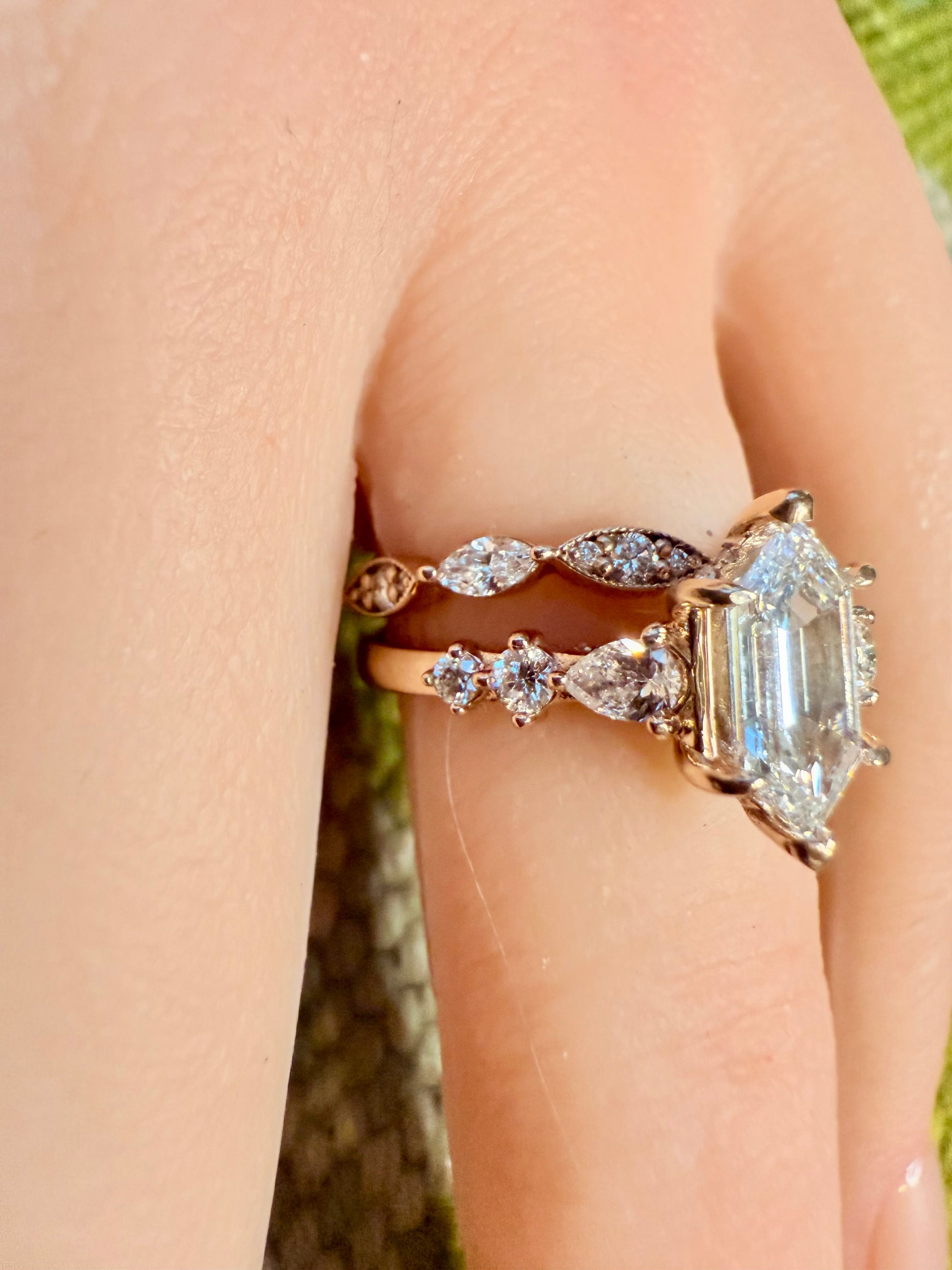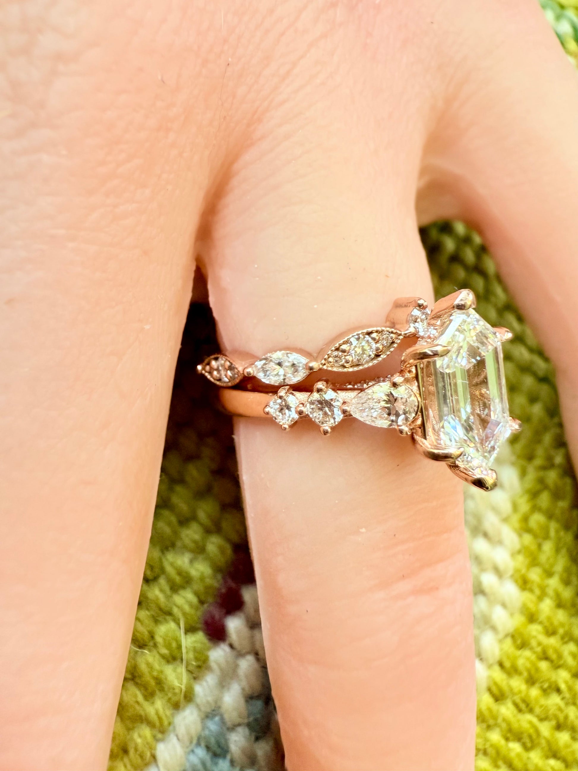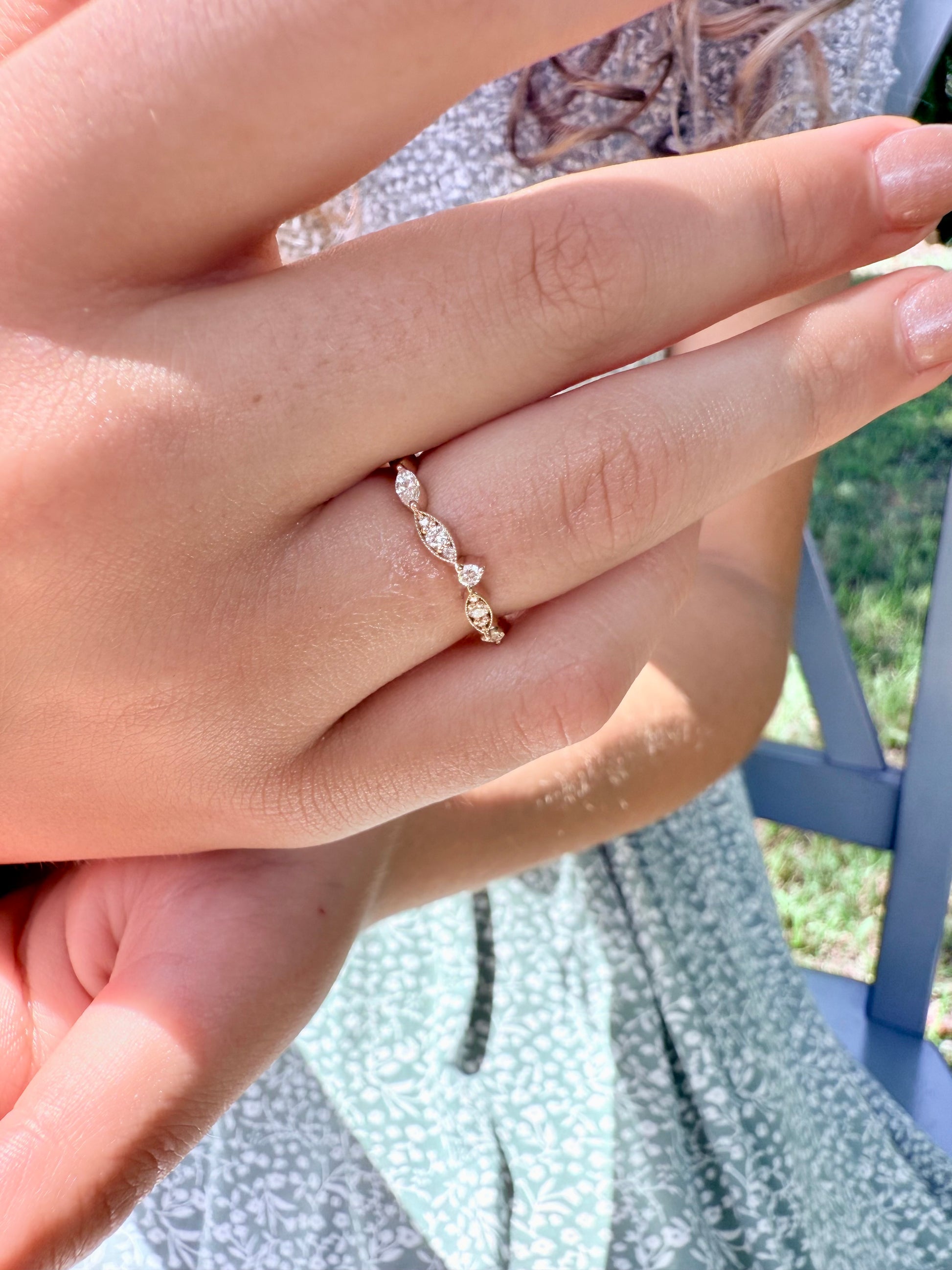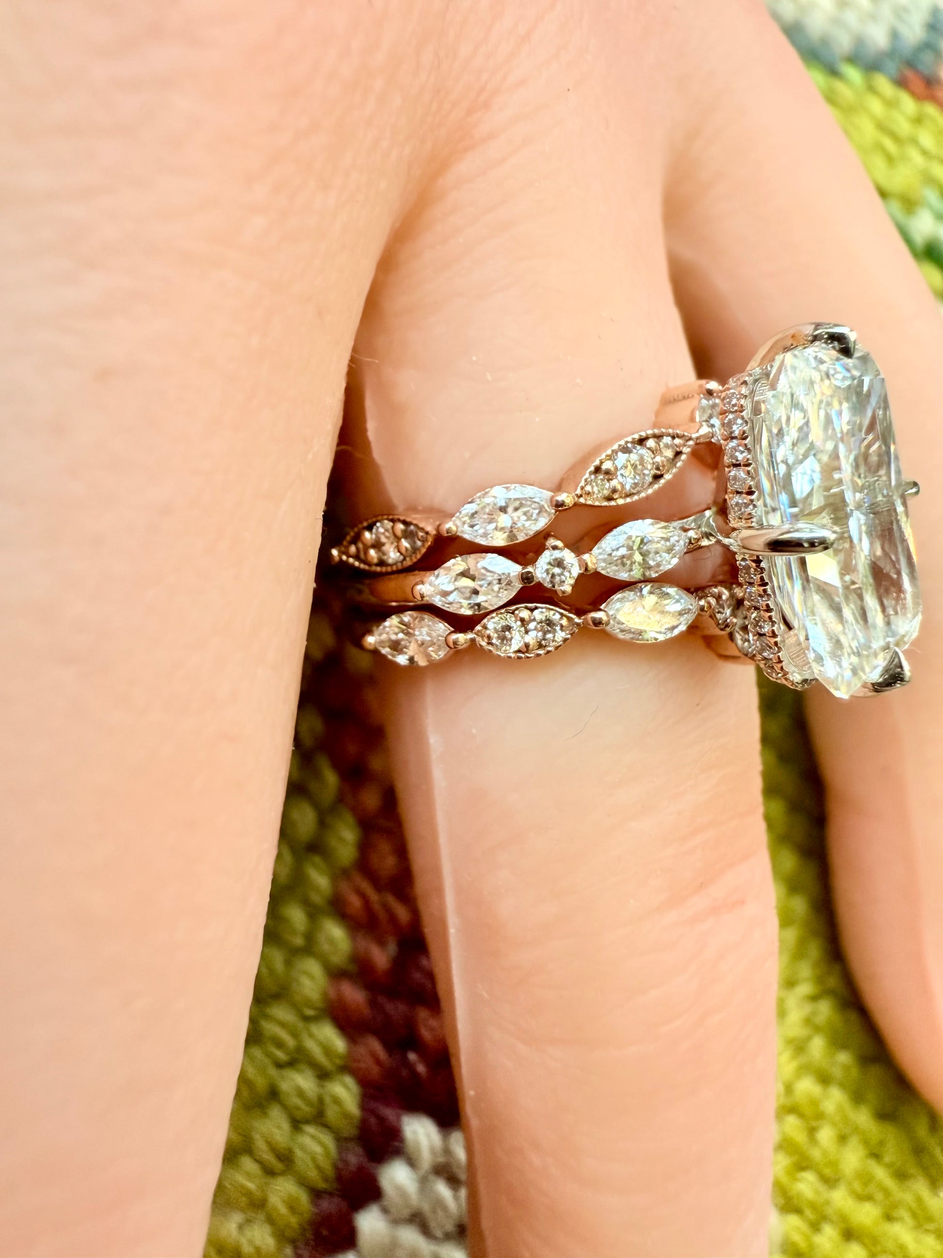 This exquisite, curved wedding band perfectly complements the Elizabeth and Vintage Marquise engagement rings, symbolizing a love that transcends infinitely with its elegantly perpetual design.